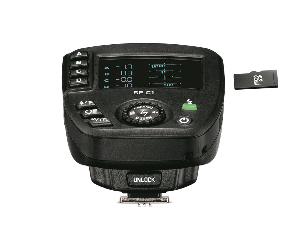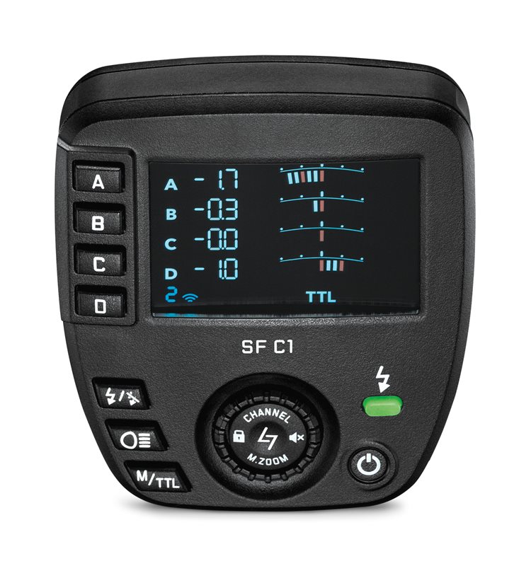 SF C1 arbetar med radiofrekvenser i 2,4 GHz-bandet och erbjuder upp till åtta separata kanaler för konfiguration av flashenheter i grupper. Blixtenheter, som kan ligga på avstånd på upp till 100 meter från SF C1 monterad på kameran, kan styras som en enskild grupp eller delas upp i upp till tre separata kontrollerade grupper. Du kan till exempel styra utsignalen från en enda blixtenhet med en skönhetsmaträtt, en strålkastare och ytterligare enheter för lätta skuggor och belysa bakgrunden.